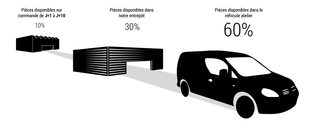 Les véhicules ateliers : Chaque technicien FIP est équipé d’un véhicule atelier dont le stock de pièces détachées permet de traiter la très grande majorité des pannes rencontrées.